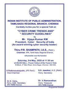 I am grateful to the IIPA Tamil Regional Branch Thiru P.R. Sampath, I.A.S (Retd.) – Chairman, Thiru S. Rathinasabapathi . I.P.S (Retd.) – Vice Chairman and Thiru S.S. Jawahar, I.A.S (Retd.) – Hon. Secretary for the invitation and for facilitating such vital conversations. Together, let’s persist in our efforts towards building a safer and more secure digital ecosystem for all.