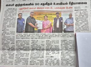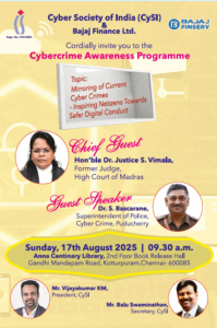 The Cybercrime Awareness Programme titled “Mirroring of Current Cybercrimes – Inspiring Netizens Towards Safer Digital Conduct,” jointly organized by CySI and Bajaj Finance Ltd., was successfully conducted on 17th August 2025 at the Anna Centenary Library, Chennai. The session was well-received by attendees and effectively raised awareness about current cybercrime trends and safer digital practices. We extend our gratitude to all participants and partners for making this event a success.